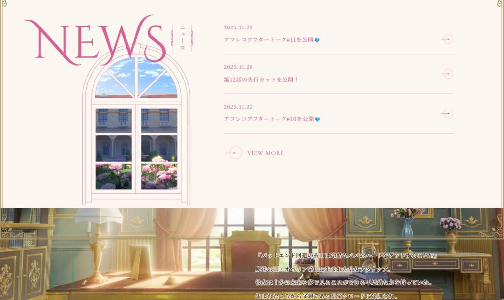 このNEWSセクションのかわいいところは、まるで “お姫様のお城の窓から外を眺めている” ような演出になっているところなんです♡